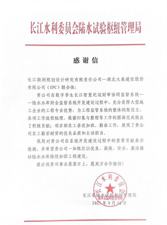 近日,公司收到长江水利委员会陆水枢纽管理局发来的感谢信,信中对公司在陆水水库除险加固工程EPC总承包工程中展现出的卓越工作成绩给予高度肯定和诚挚感谢。