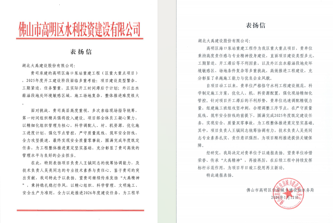 表扬信既是荣誉也是鞭策。未来,公司将继续发扬“大禹精神”,持续发挥标杆示范作用,全力推进2026年度建设任务、为工程竣工投用再立新功。
