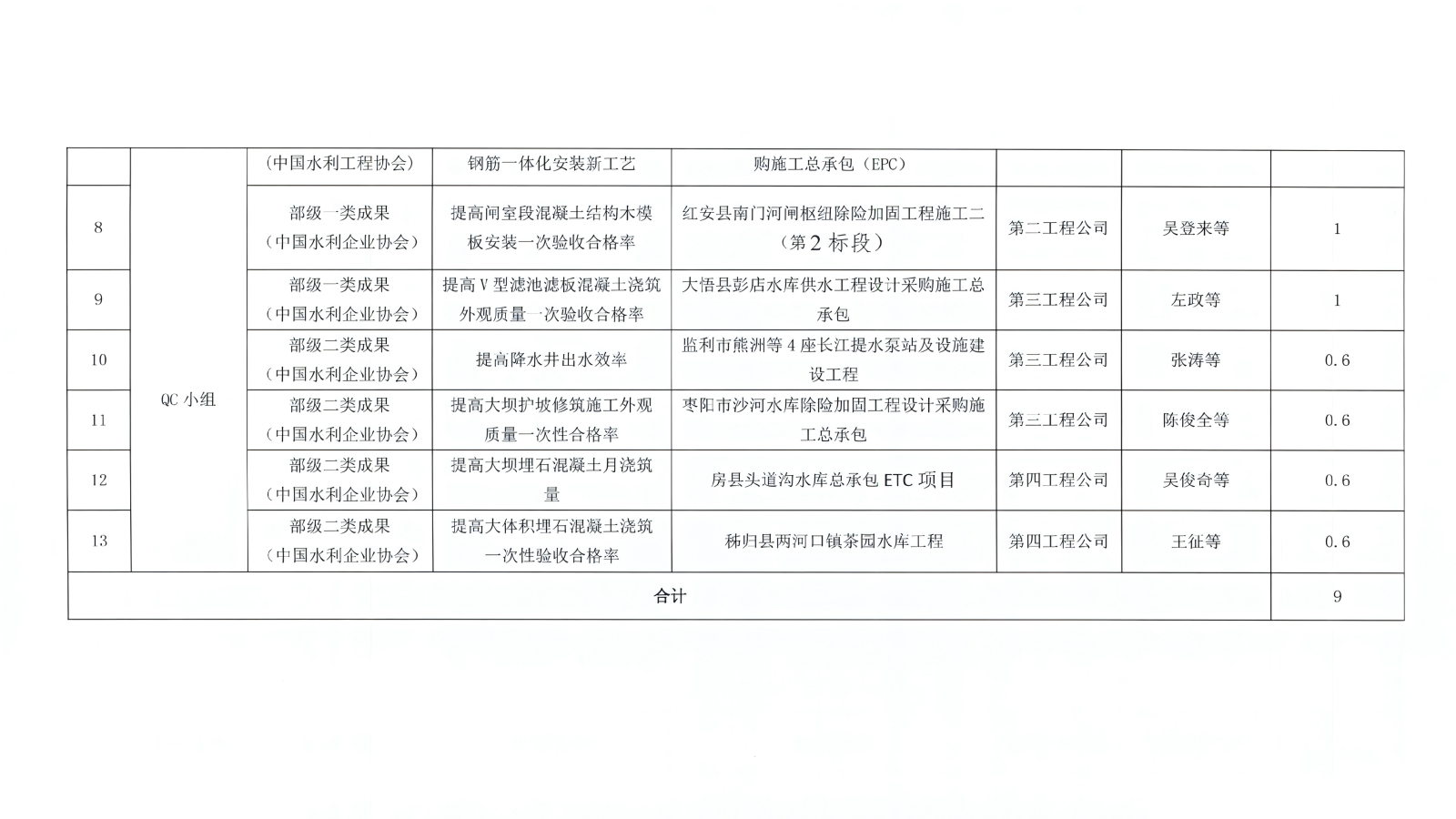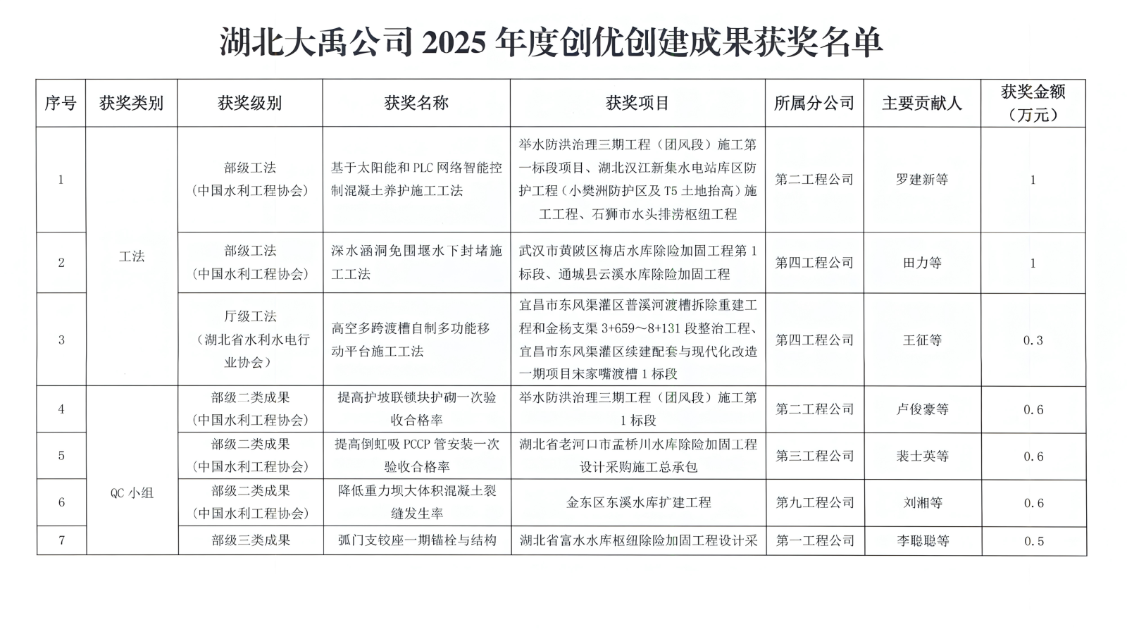 2025年,公司创优创建活动蓬勃开展,取得了较好的成绩。根据公司发展规划要求及行业市场信誉、业绩需要,为进一步提升公司软实力,鼓励全体员工积极投入到创优创建活动中来,勇于创新、勤于创建,为公司未来发展做出更多贡献。根据《湖北大禹建设股份有限公司关于印发2025年质量创优奖惩办法的通知》,现决定对2025年度获奖单位及个人进行表彰奖励,名单如下: