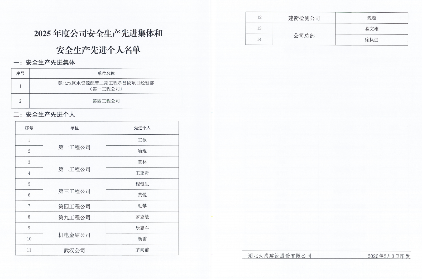 公司安委会对各部门、各生产经营单位安全生产考核结果进行考评审核,决定授予鄂北地区水资源配置二期工程孝昌段项目经理部(第一工程公司)及第四工程公司2025年度安全生产先进集体荣誉称号,授予王泳等14位同志安全生产先进个人荣誉称号。